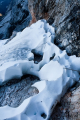 Sledi kratek spust nato pa začete ferate pod previsom. Nekaj malega poplezavanja ob zajli, precej gaženja po snegu in kmalu sva na platoju, kjer se gledamo z Ajdovsko deklico iz oči v oči.