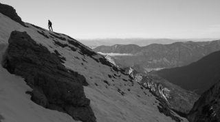Ko prispeva na vrh hriba, v daljavi zagledava vrh. “O mater, tole je še vsaj pol ure!” Mare je situacijo odlično ocenil, saj sva za pot do vrha potrebovala točno pol. Kljub soncu je bil večji del grebena še vedno ovit v sneg, senčni deli pa so trdo zaledeneli, tako da je uporaba derez in cepina nujna, čeprav se vedno da najti obvoz po sončni strani.