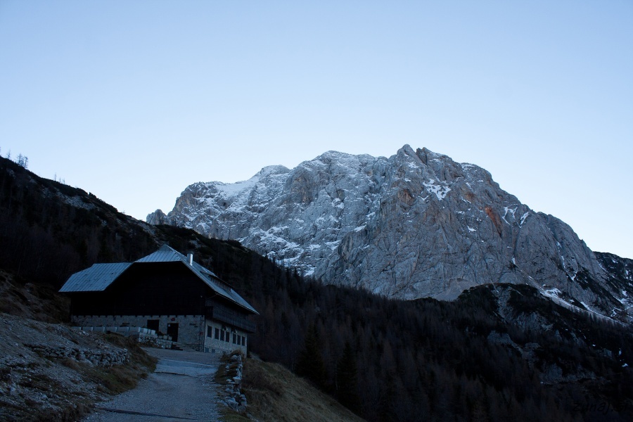 Na Vršiču nobene toplote. Hitro nase navlečeva bunde in se počasi podava na pot. Malo pred Poštarskim domom se odcepiva proti Prisojniku, nekaj minut kasneje pa naletiva na prvo markacijo za Okno.