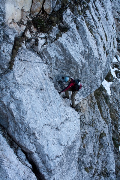 Naposled le prispeva do plezalnega dela, kjer se zapodiva v zavarovano pot. Lepa plezarija, en del malo previsen, drugi komaj dovolj širok za moj trebuh in nahrbtnik. Škoda, ker ni več takšnih delov na poti.
