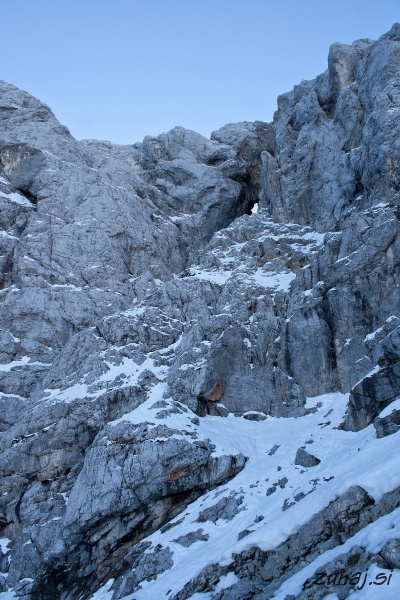 Malo višje nama sneg povzroča nekaj težav pri prehodu v plezalni del, saj se markacij ne vidi, skale pa pokriva tanka plast snega, kar zna bit nevarno za zdrs, česar si tam ne želiš.