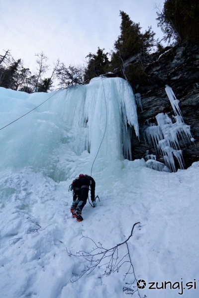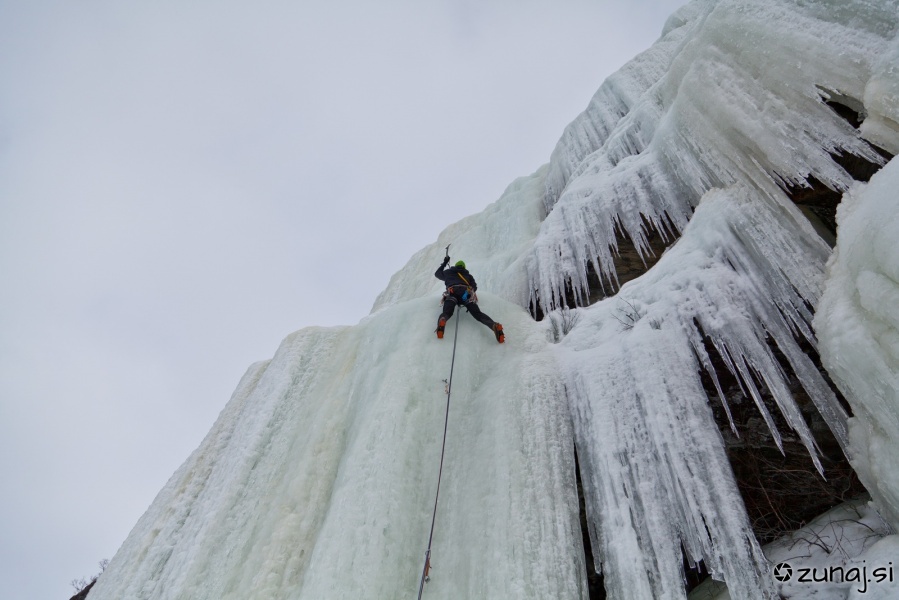 Hitro si opasamo kovino in Luka ter Igor naredita prve korake. Ker je slap bolj lahek, se trudimo iskati linijo, ki bi ponudila čim več plezarije.
