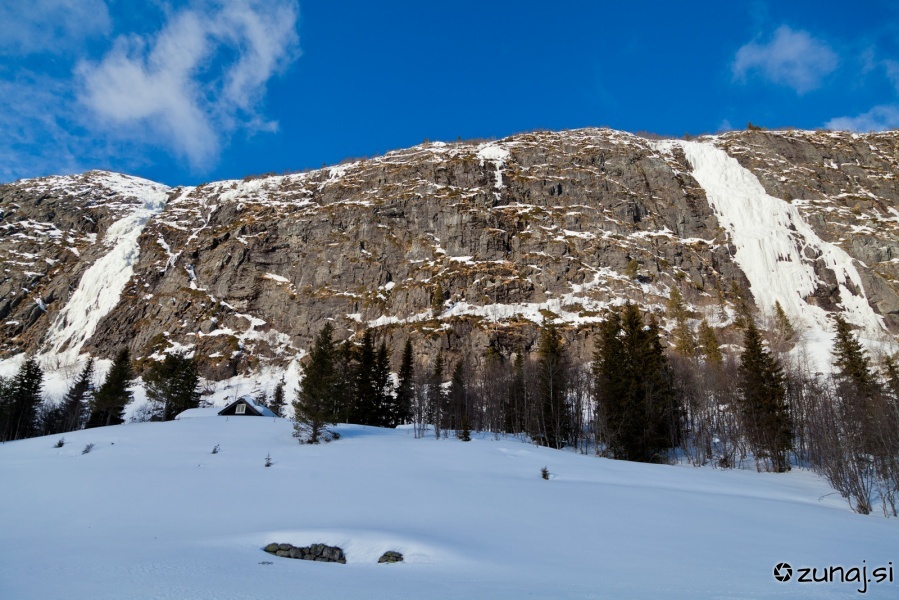 Zjutraj se napokamo jajc in šunke, se Larsu zahvalimo za gostoljubje in jo mahnemo proti dolini Valdres, točneje proti naselju Bagn in dolini Stavedalen nad vasjo. Kljub jasnemu vremenu in soncu smo zaskrbljeni. Termometer v avtomobilu kaže 7°C. In to ne minusa. Kaki 2 uri kasneje smo v dolini in slapovi se vidijo že na daleč. Ogromni so! Vsaj za nas, ki smo vajeni ozkih slapov v Tamarju in pod Prisankom. Od daleč zgledajo dobro, zato se vseeno odločimo poizkusiti…