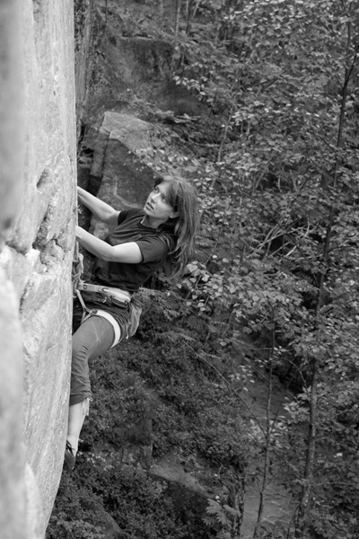 Iz vrha hriba se vrnemo kakih 30m nazaj in navzdol pod steno, kjer je plezališče. Nekaj časa iščem sektor v vodničku, potem pa Mare za pas zatakne metulje in jebice, ter se poda v prvo trad smer z oceno 3+. No, smer je bila vse prej kot 3+, prej 5b, sploh glede na pomanjkanje prostora za nameščanje varovanja.