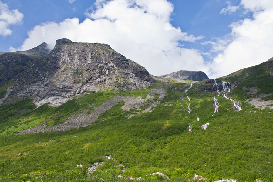 Trollova cesta je ena izmed velikih znamenitostni Norveške. Vije se po cesti 63 iz Andalsnesa pa vse tja do znamenitega fjorda Geiranger. Iz Andalsnesa se najprej, po vijugasti cesti, dvignemo na 1000 m.n.v. 10% klanec je bil kar zalogaj za najino Hondico. Razgled, ki pa ga ponuja cesta, je pa nor1. Na žalost sva bila zanj prikrajšana, saj je bilo nebo poseljeno z oblaki in meglo. Med potjo prečkava tudi dokaj velik slap. No, pa na splošno naju je ta dan spremljalo ogromno velikih slapov.