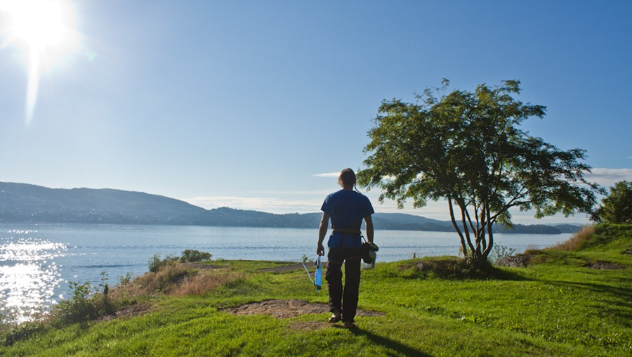 Ker pod steno ni primernega prostora za postavitev šotora, se odpeljeva kakih 10km naprej proti Heroysund-u, kjer najdeva primeren prostor na plaži(N59,92387° E5,79068°) ob marini.