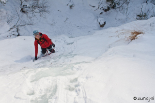 Najprej sva splezala drugi slap, ki je dolg 15m. Zanimivo je plezati po slapu, kjer skozi led vidiš teči vodo. Slap je dokaj lahek in si zasluži oceno 3.