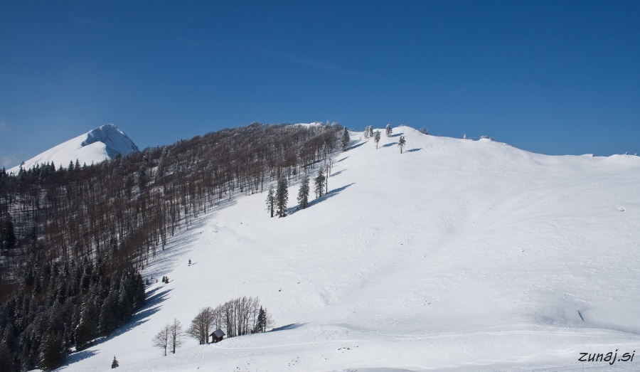 Z avtom se zapeljem do Javorniškega Rovta, kjer nataknem verige in se zapeljem naprej do Križevcev in si tako skrajšam dolgočasno pot po cesti za vsaj 40 minut. Dva ravno prismučata navzdol in na hitro ju povprašam po razmerah. “Skos slabše je, midva sva verjetno ujela zadnjo dobro vožnjo!” Na noge smučke, na rame nahrbtnik, okoli vratu fotoaparat in gasa v hrib. Po 100m slečem vetrovko in nadaljujem v Craftu. Hitro se znajdem na Pustem rovtu, kjer se odpre čudovit pogled na planino, greben Golice v daljavi in Kočno desno nad menoj.