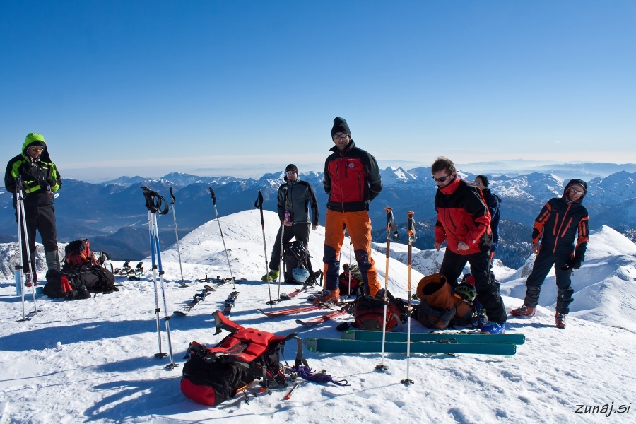 Primož se je na vrhu razorja odcepil levo proti Hladilniku, saj je bil brez smuč in bi bila pot zanj predolga, ostali pa smo zavili desno proti soncu in Zadnjemu Voglu.