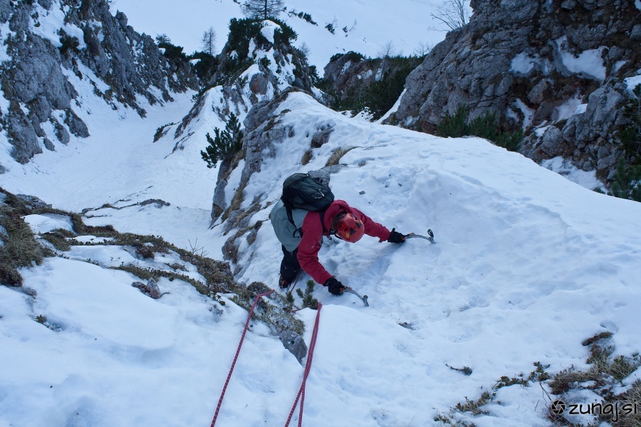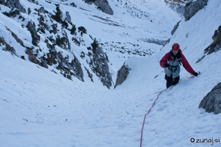 Pod vstopom se Remic strinja, da ne zgleda hudo in da greva lahko nenavezana. “OK!” Malo popraskam po skali in sem v grapi, Remic pa si medtem časom premisli in iz vrha “detajla” mu spustim vrv, da se naveže in tako veliko lažje opravi z vstopom.